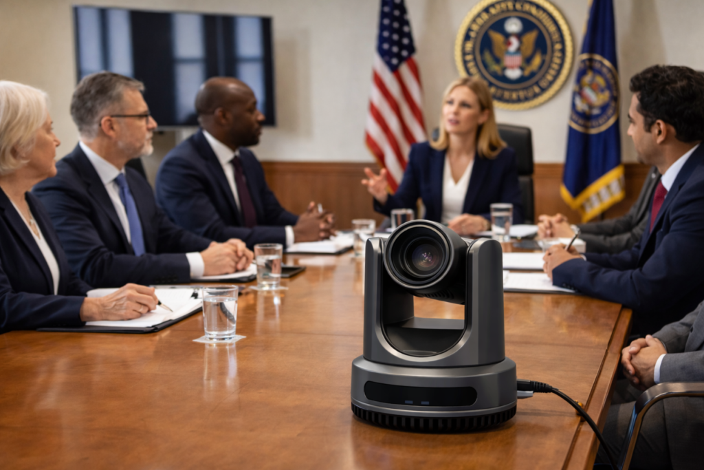 A Smart Auto-Tracking Camera is an advanced camera system that automatically follows a speaker or moving subject without manual operation.