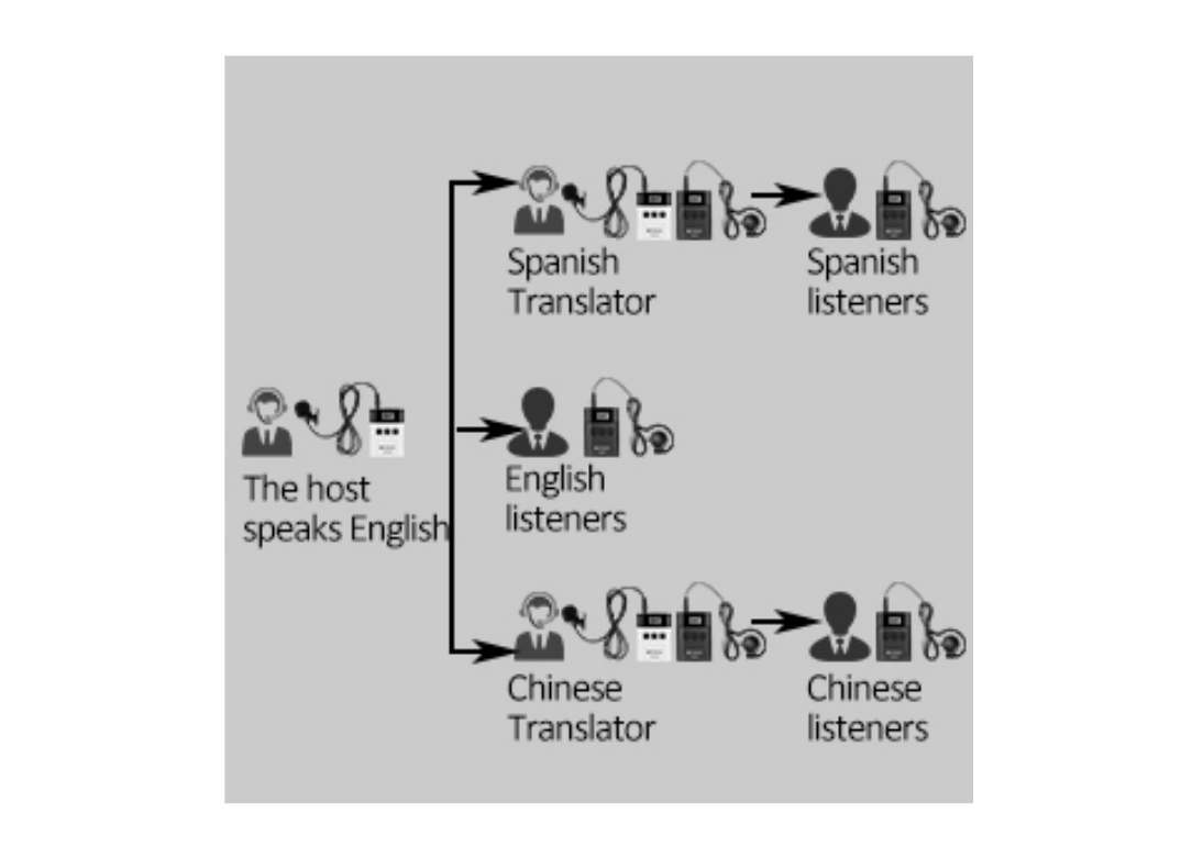 This system allows interpreters or speakers to transmit their voice wirelessly to multiple listeners using portable receivers. Each listener can hear the translation clearly through a lightweight headset.